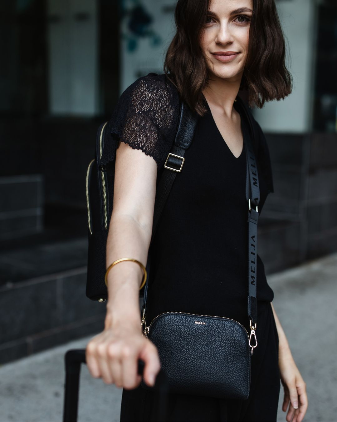 The OLYNA cross-body mirrors MIRA’s silhouette and is crafted from the same premium leather, lining, and light-gold hardware. Ideal for business travel, it keeps your passport, boarding pass, and phone within easy reach while wearing your backpack — then becomes your polished go-to for dinners and networking. When not in use, it slips neatly into the base of the MIRA’s front pocket.